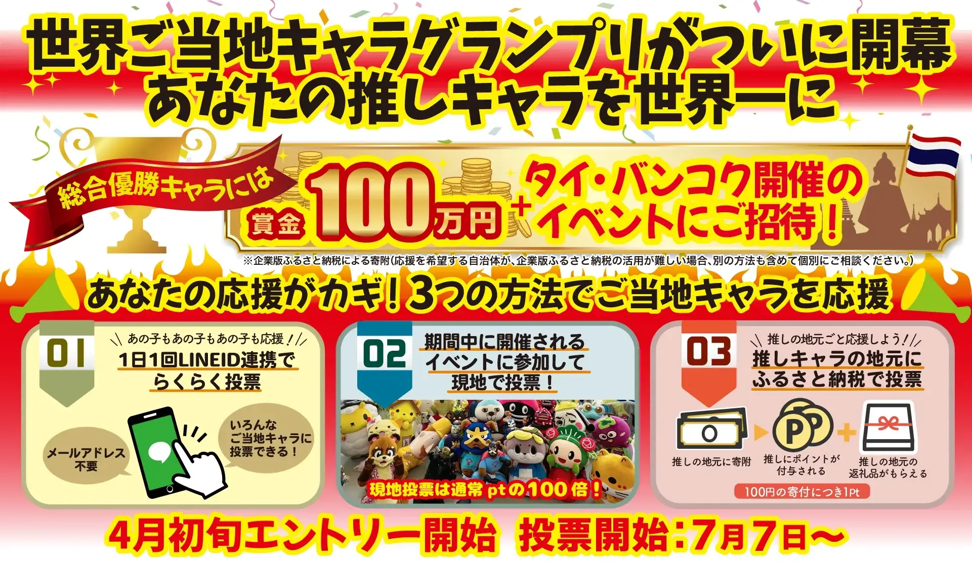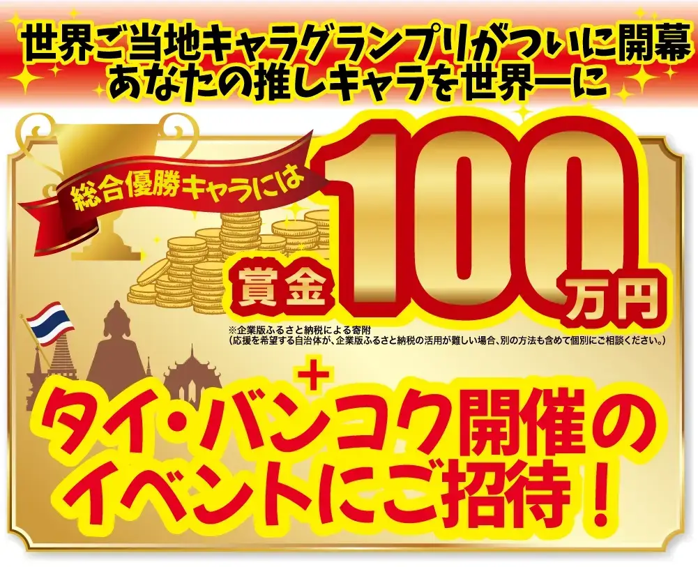 ※表示されている総合優勝の賞品は日本国内のご当地キャラ向けになります。その他の副賞についてはホームページにて順次ご紹介していきます。